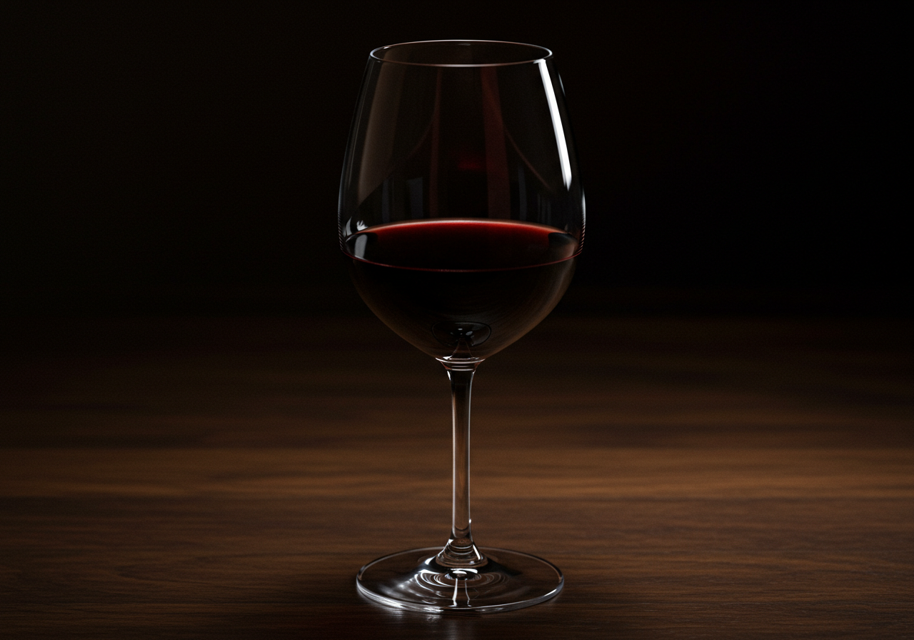 A dimly lit glass of red wine half full, untouched — symbol of deliberate restraint and precision.