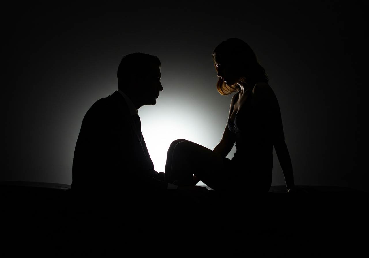 A man and woman in silhouette, the man seated motionless while the woman’s body leans toward him, her attention drawn by his stillness, erotic tension conveyed through posture, elegant noir lighting