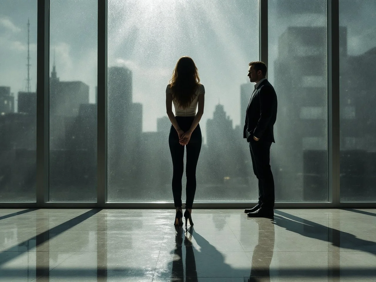 Erotic symbolism: a woman standing in shadow, her body tense, while a man sits still in calm authority, his posture radiating clarity, cinematic light