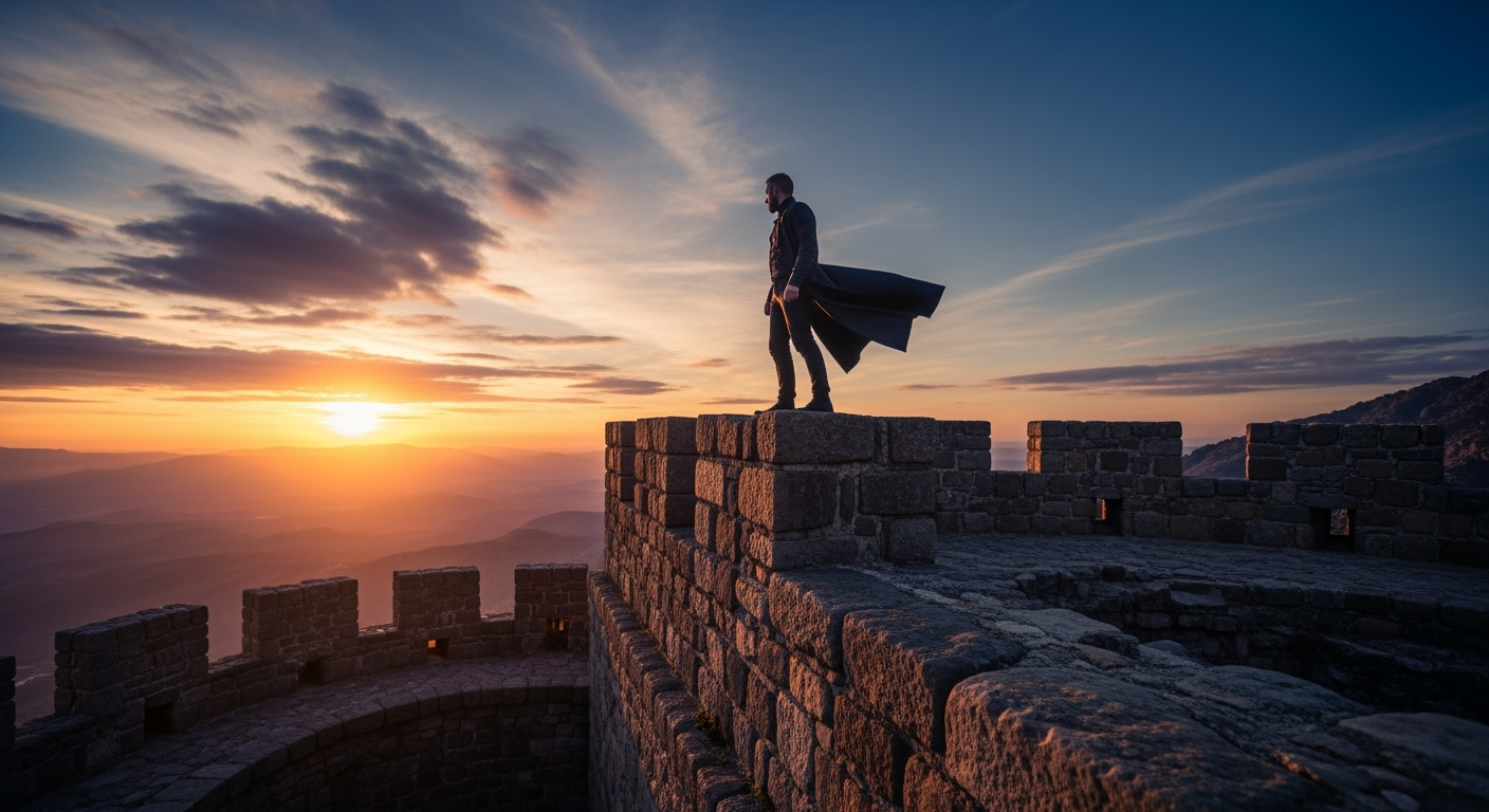 A man standing on top of a fortress wall at dawn, coat blowing in the wind, horizon stretching ahead, cinematic grandeur.