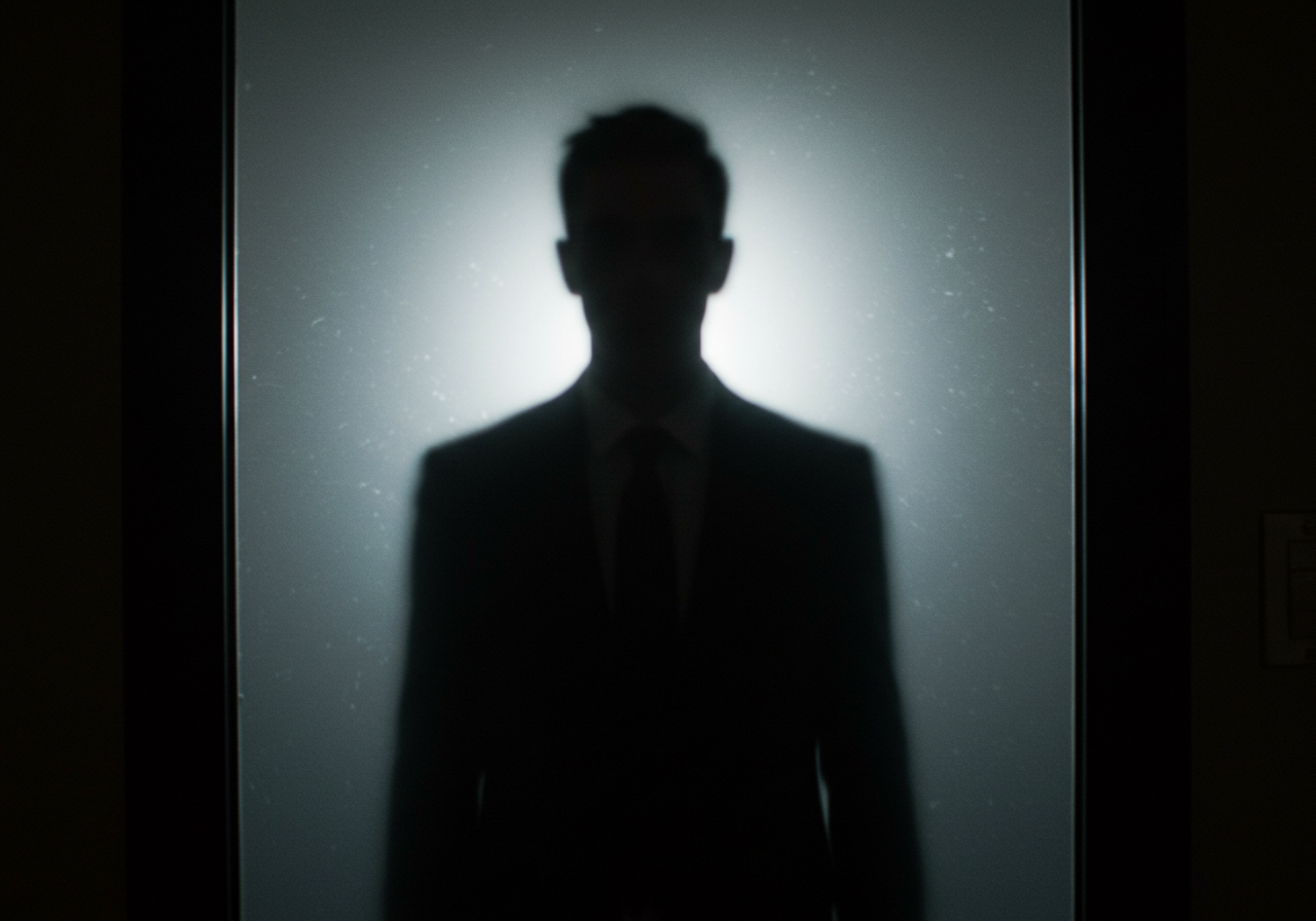 A man’s silhouette seen through a frosted glass door, his outline sharp but inaccessible, cinematic atmosphere.