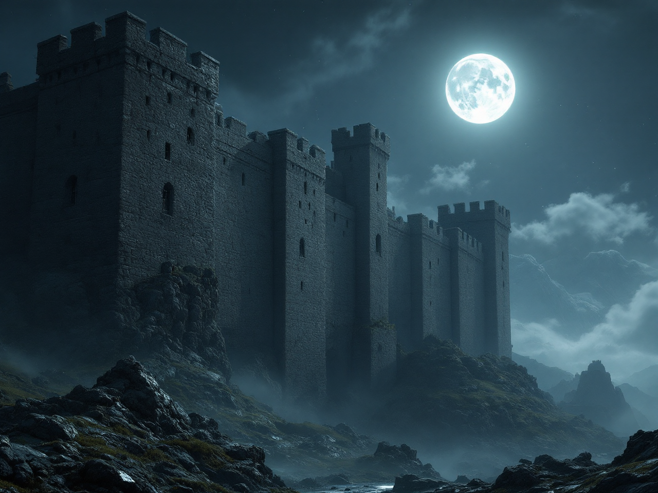 A massive stone fortress with no windows, only solid walls, standing under moonlight, cinematic hyperreal realism.